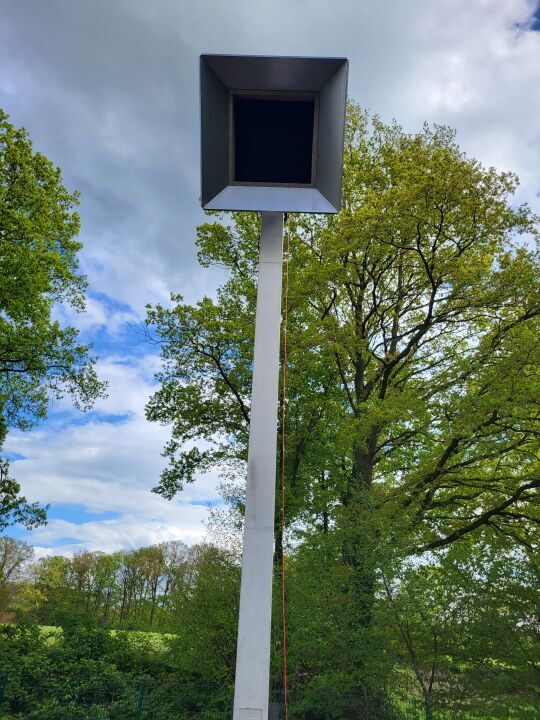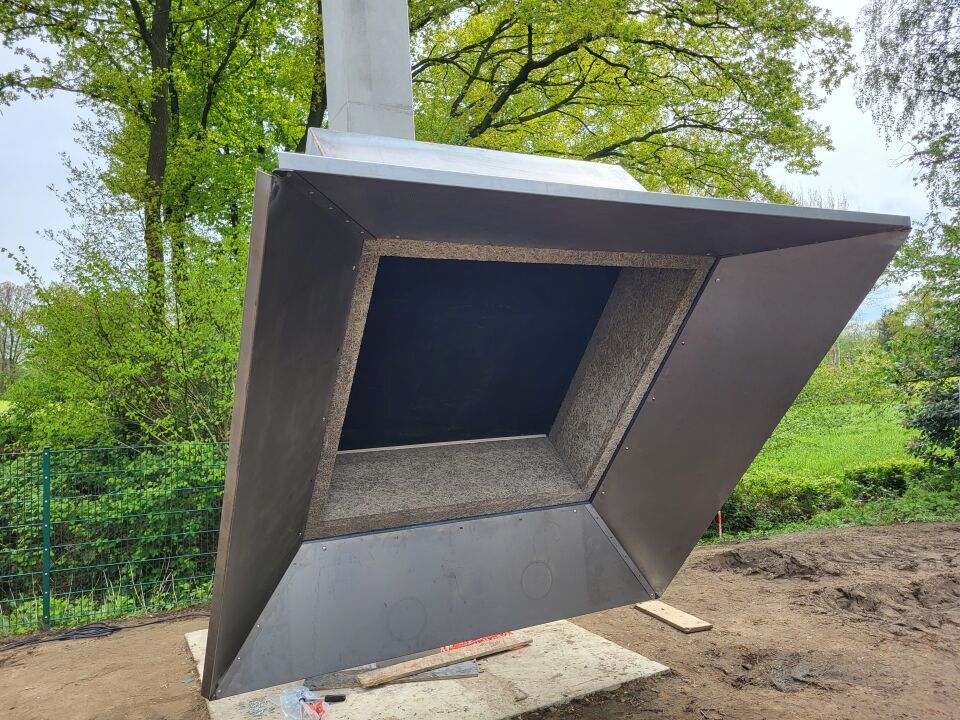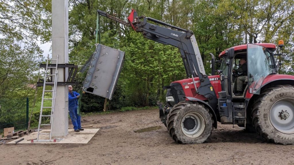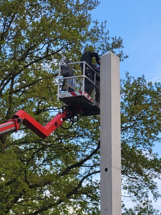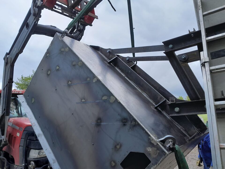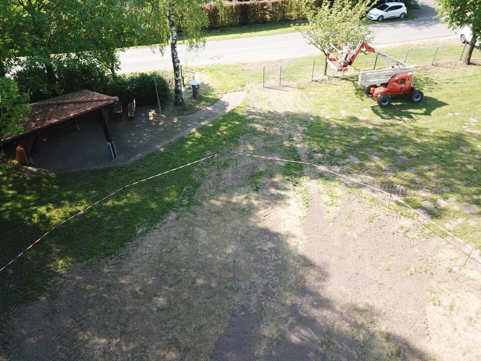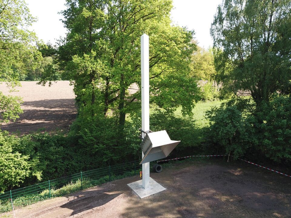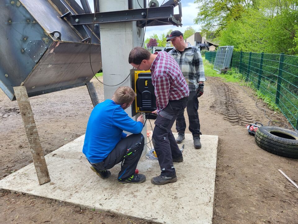 Hier sehen wir den Transport des neuen Kugelfangs zum Schützenplatz und das Anbringen an die neue Vogelstange. Im Abstand von einigen Tagen erfolgten die Montage von Seil und Umlenkrolle, sowie das Anbringen der Seilwinde und der Trichterbleche.