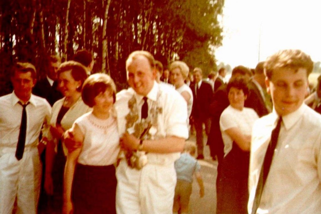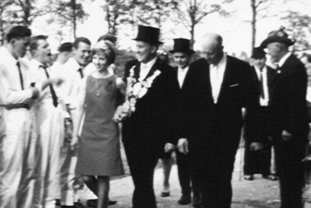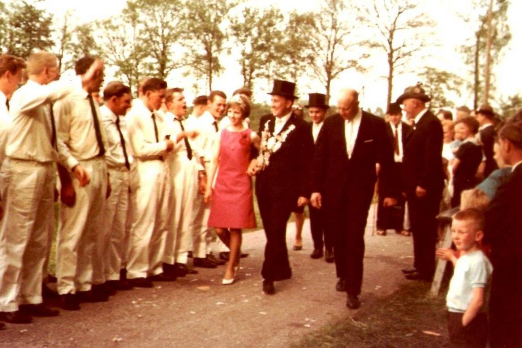 In gewohnter Weise begann auch das Schützenfest 1967. Nach dem Gedenkhochamt trafen sich die Schützenbrüder am Festzelt und marschierten kurz nach 1.00 Uhr bei strahlendem Sonnenschein zur Vogelstange. Dort begann man gleich mit dem Königsschießen, als die üblichen Formalitäten erledigt waren. Als man nach einiger Zeit zur Donnerbüchse griff, konnte man den stolzen Vogel wenig anhaben. Er war wohl wieder mal aus besonderem Holz geschnitzt. Doch seine Majestät Bernhard verstand es, seine Königswürde zu verteidigen. Nach gezieltem Schuss hob sich der Vogel nach oben von der Stange und fiel in einem Stück zu Boden. Da staunten alle und fragten: was nun. Aber König Bernhard verzichtete auf weitere Regentschaft und überließ deinem Bruder Willi die Königswürde. Willi Wieschhörster wurde hiermit neuer Schützenkönig und erkor sich Fräulein Maria Lewe zur Königin. Gegen 16.30 Uhr wurde das neue Königspaar proklamiert und der Schützenzug marschierte zum Festzelt zurück, wo anschließend der Königstanz den Auftakt zum Festball gab.
