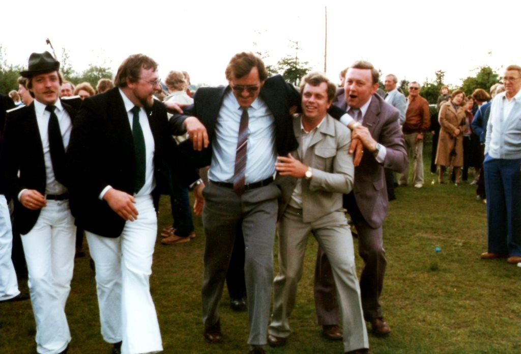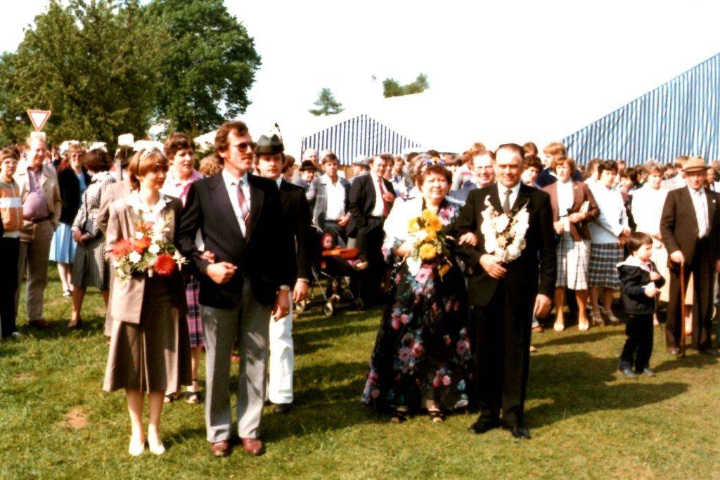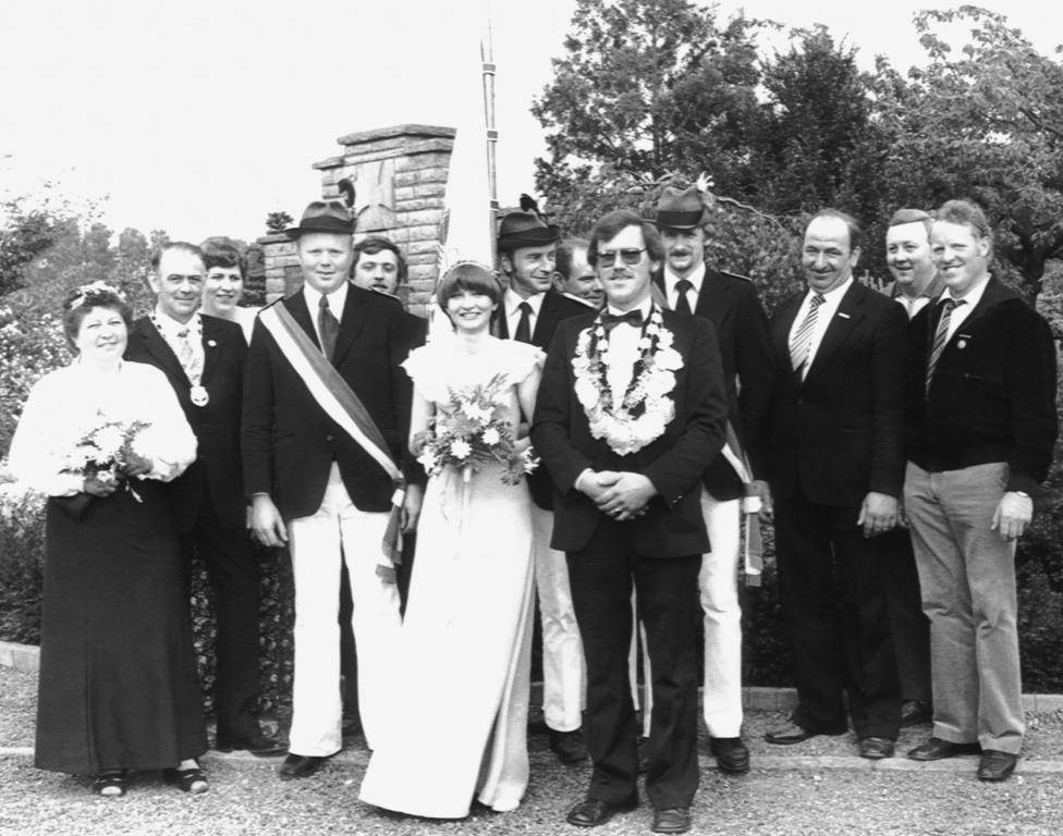 „Antreten zum Vogelschießen!“ hieß es dann am Sonntag eine Stunde nach Mittag. Rund 70 „Börnster Jungs“ ließen sich diese Aufforderung nicht zweimal entgegenbringen und schossen, was das Zeug, genauer der Vogel hielt. Von den „vier ernsthaftesten Anwärtern“, wie der stellvertretende Schützenvereins-Vorsitzende Josef Lücke sich ausdrückte, hatte Josef Geilmann das beste Zielwasser getrunken. Um 16.20 Uhr besaß Lücke dann die Ehre, in Vertretung des ersten Vorsitzenden, Heinrich Gövert, die Proklamation des Königspaares vorzunehmen. Die erste große Bewährungsprobe bestand das frisch gekürte Königspaar Stunden darauf mit Bravour – den Königstanz während des Festballs.