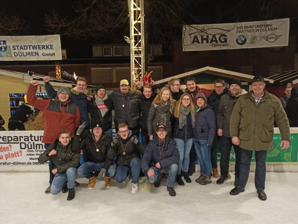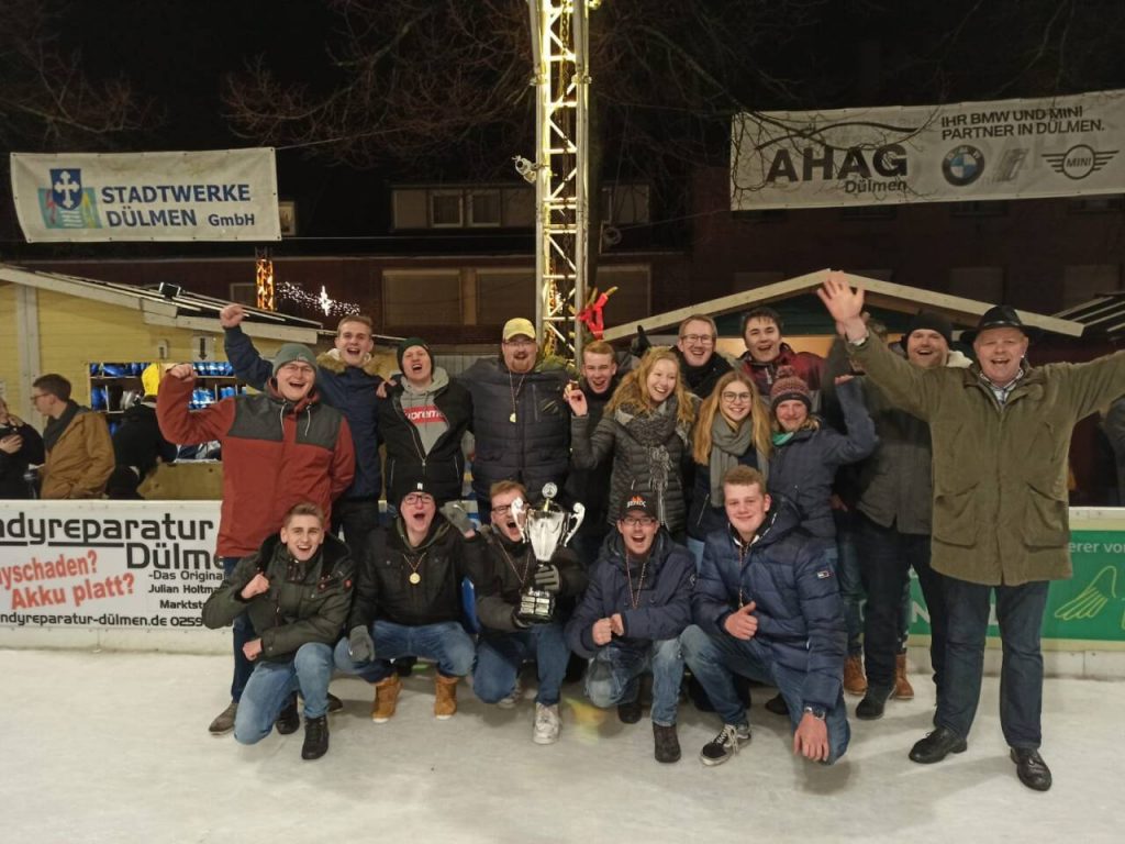 30 Teams mit 170 Teilnehmern traten beim Young-People-Cup im Eisstockschießen an. Trotz nasskaltem Wetter auf dem Dülmener Marktplatz war Börnste mit 20 Teilnehmern in 3 Mannschaften vertreten. Und das sehr erfolgreich. Gleich 2 Teams schafften es bis ins Halbfinale in dem man aufeinander traf. Somit war klar, eine Mannschaft erreicht das Finale, die andere spielt um Rang drei. Beide Spiele waren an Spannung nicht zu überbieten und gingen ins Stechen. Im Spiel um Rang 3 unterlag das Börnster Team knapp. Aber der große Wurf gelang im Endspiel. Mit ein wenig Glück und viel Können geht der Siegerpokal nach Börnste.