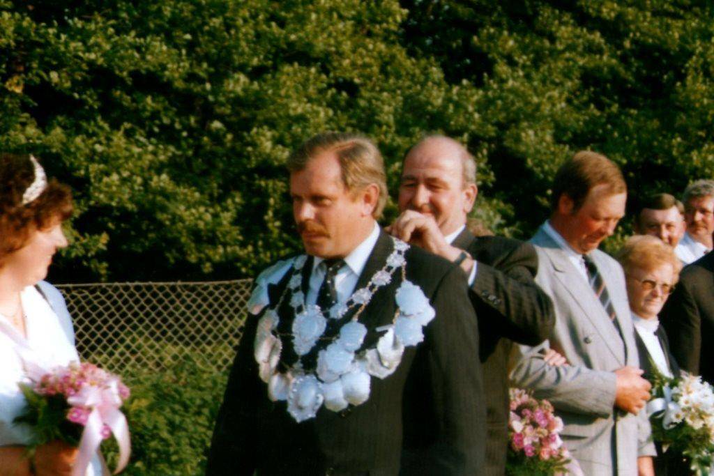 Der Börnster Schützenpräsident Lücke überreichte dem neuen Regenten Paul Brambrink bei der sich anschließenden Proklamation die Königskette.