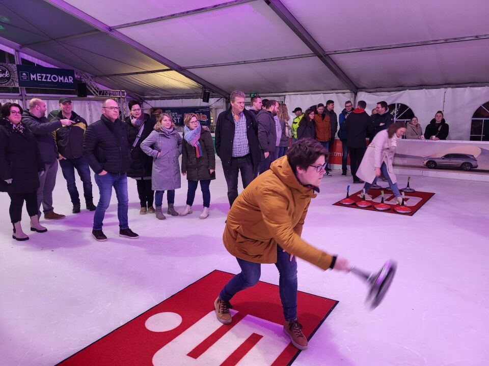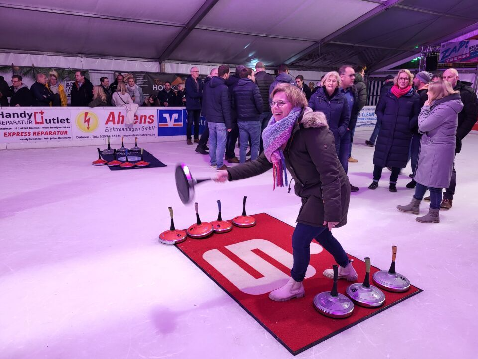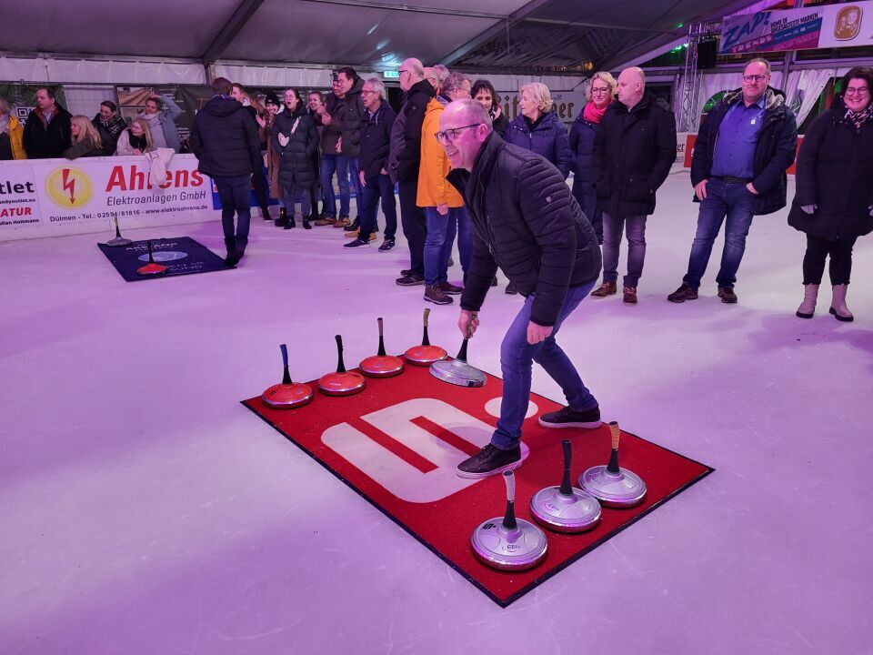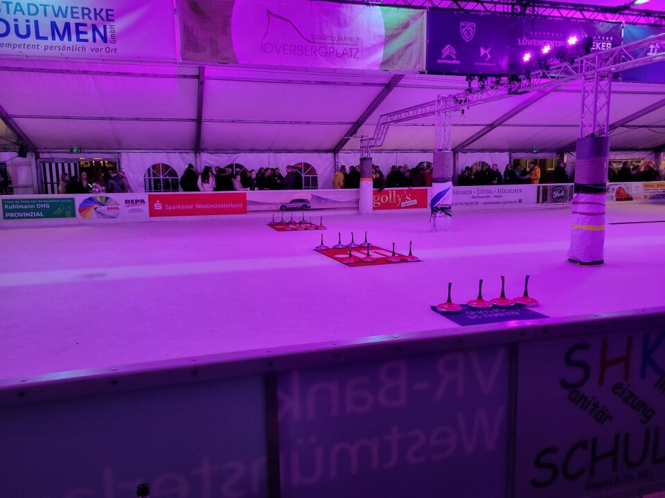 Freitagabend auf dem Dülmener Marktplatz. Es ist angerichtet für Spitzenwintersport. Nach drei Jahren corona- und witterungsbedingter Pause gings für die Dülmener Schützenvereine wieder aufs Eis. Der Einladung des Bürgerschützenvereins waren alle 17 Vereine und die Stadtkapelle gefolgt.