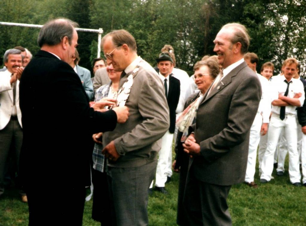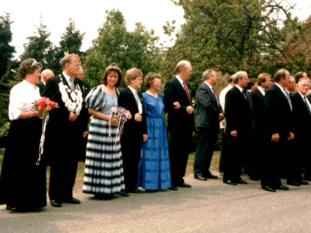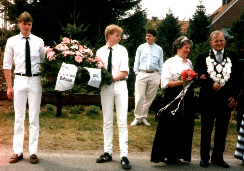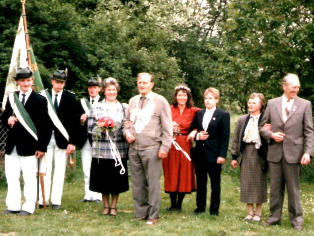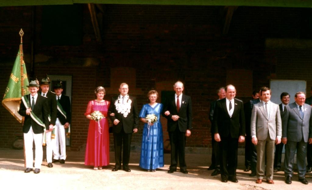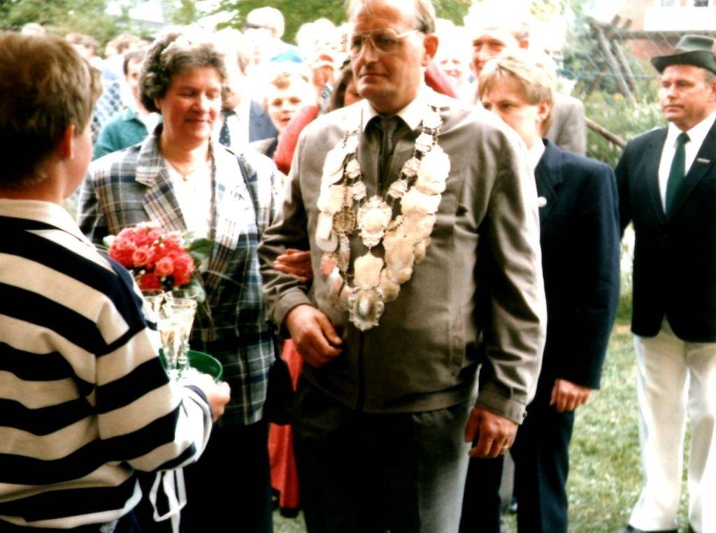 Der Reigen der Dülmener Schützenfeste 1988 wurde am Wochenende traditionell vom Börnster Schützenverein eröffnet. Dabei freuten sich die Organisatoren in diesem Jahr über eine besonders rege Teilnahme an den Festlichkeiten, was insbesondere der große Andrang beim Königsschießen am Sonntagnachmittag verdeutlichte. Genau um 16.19 Uhr war es schließlich, als Theo Stegemann seinen zahlreichen Mitbewerbern um die Königswürde das Nachsehen gab und mit dem 155. Schuß den Holzvogel von der Stange holte. Unter dem Jubel der anwesenden Schützenbrüder und Besucher wurde die neue Majestät geschultert und gefeiert.