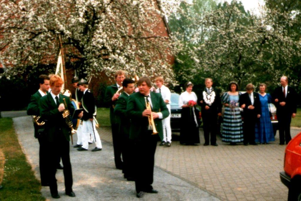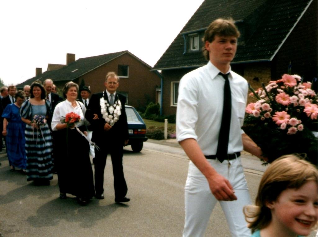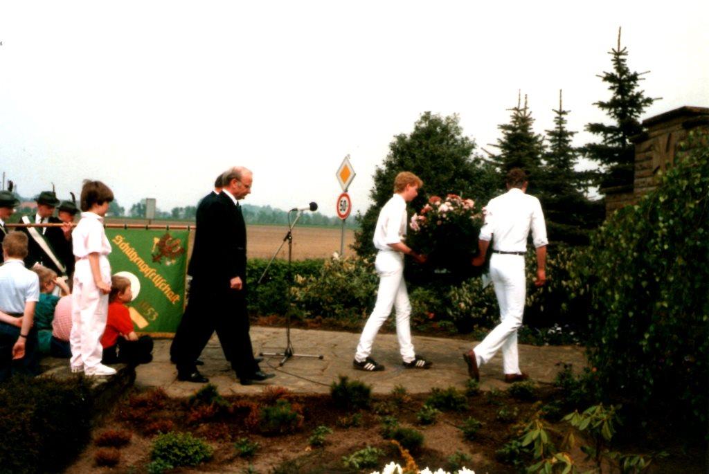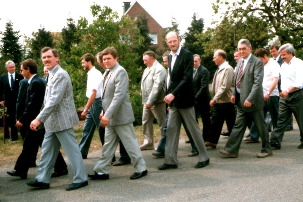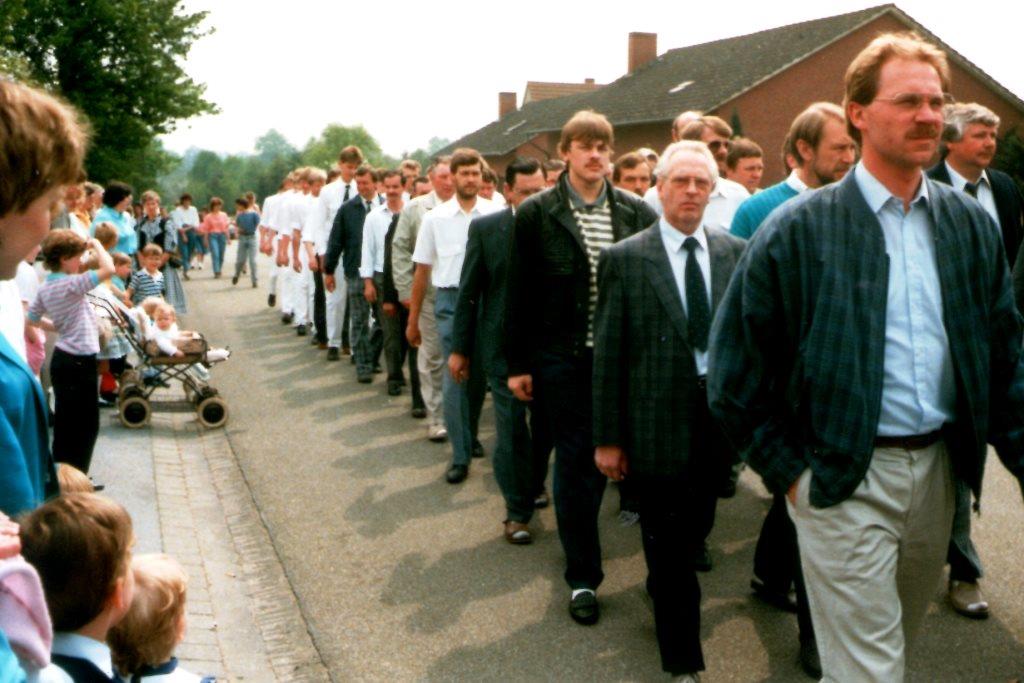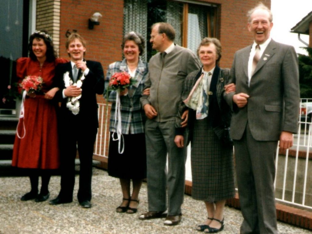 Der Reigen der Dülmener Schützenfeste 1988 wurde am Wochenende traditionell vom Börnster Schützenverein eröffnet. Dabei freuten sich die Organisatoren in diesem Jahr über eine besonders rege Teilnahme an den Festlichkeiten, was insbesondere der große Andrang beim Königsschießen am Sonntagnachmittag verdeutlichte. Genau um 16.19 Uhr war es schließlich, als Theo Stegemann seinen zahlreichen Mitbewerbern um die Königswürde das Nachsehen gab und mit dem 155. Schuß den Holzvogel von der Stange holte. Unter dem Jubel der anwesenden Schützenbrüder und Besucher wurde die neue Majestät geschultert und gefeiert.