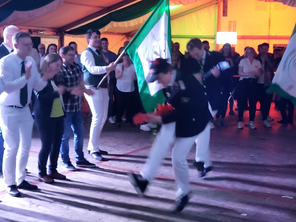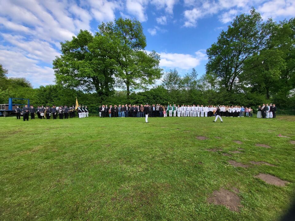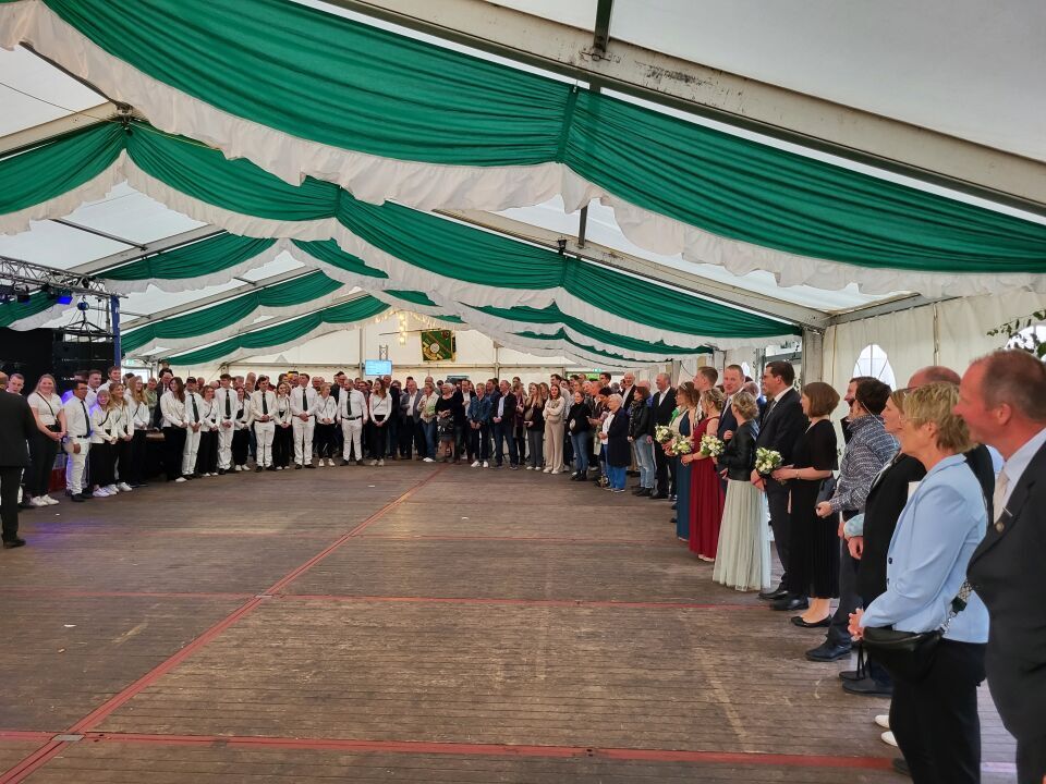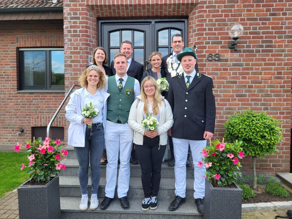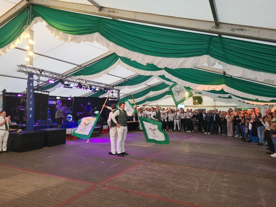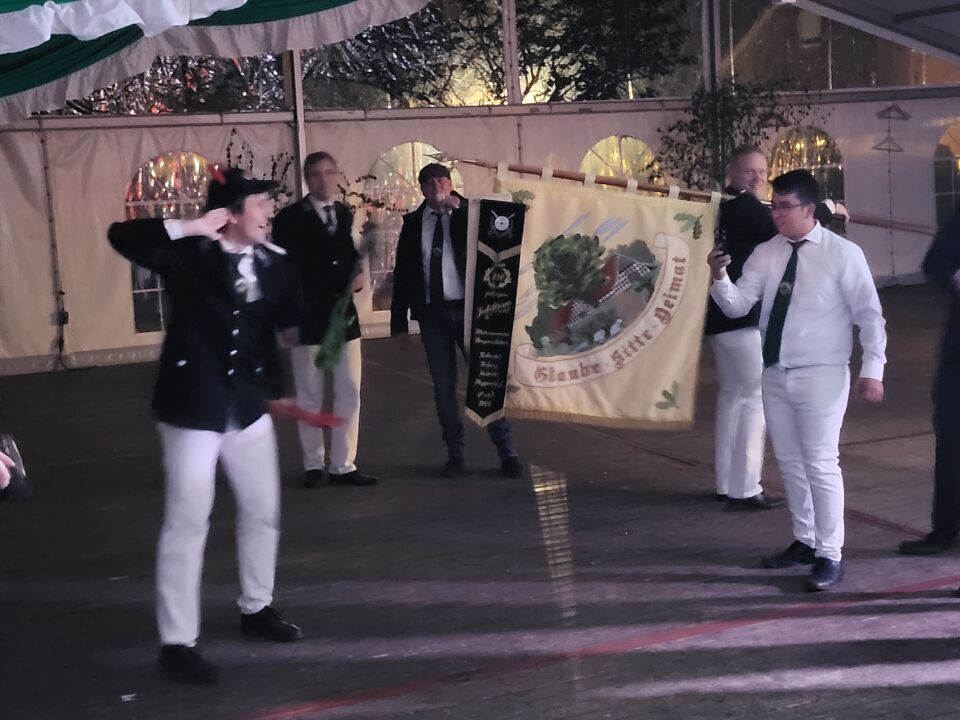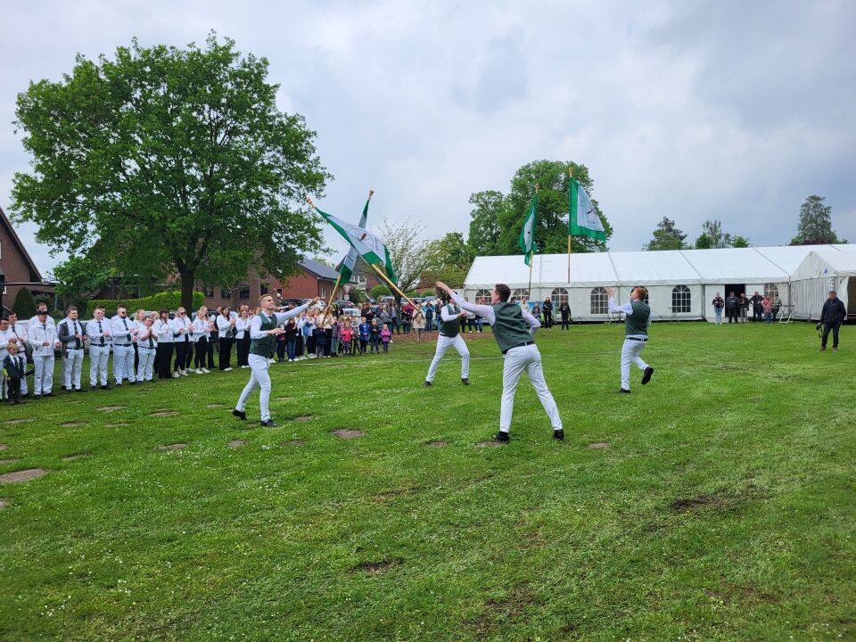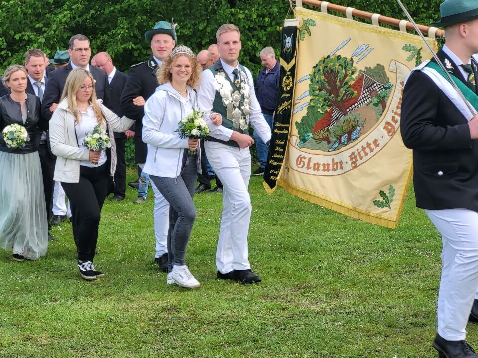 Pünktlich um 13.30 Uhr steht die Kompanie im Festzelt zum Antreten bereit. Nach dem Marsch zum Hof Brambrink wartete man gespannt auf das Erscheinen des noch amtierenden Königspaars samt Gefolge. Nach der Meldung an König Carsten, Königin Verena und dem Ehrenpaar Steffi und Claus schritt man zusammen mit Kommandeur Frank Brambrink unter großem Jubel die Kompanie ab und reihte sich in den Zug ein. Zurück auf dem Festplatz stellten unsere Fahnenschläger ihr Können unter Beweis.