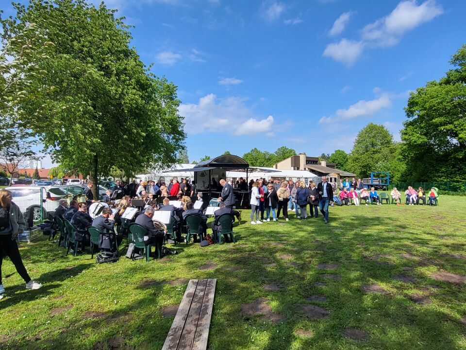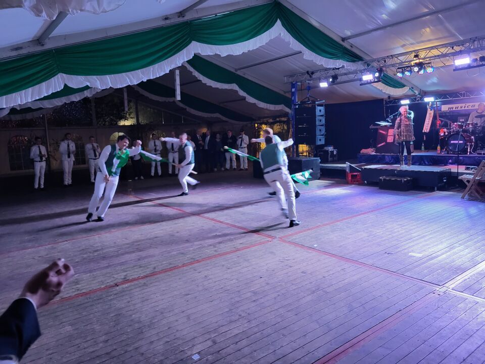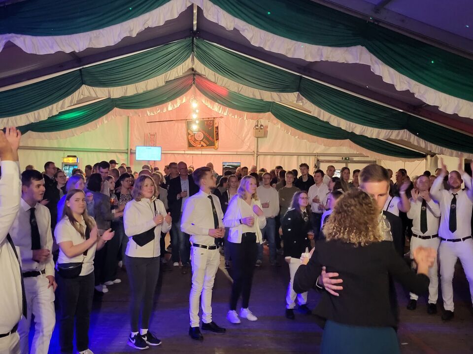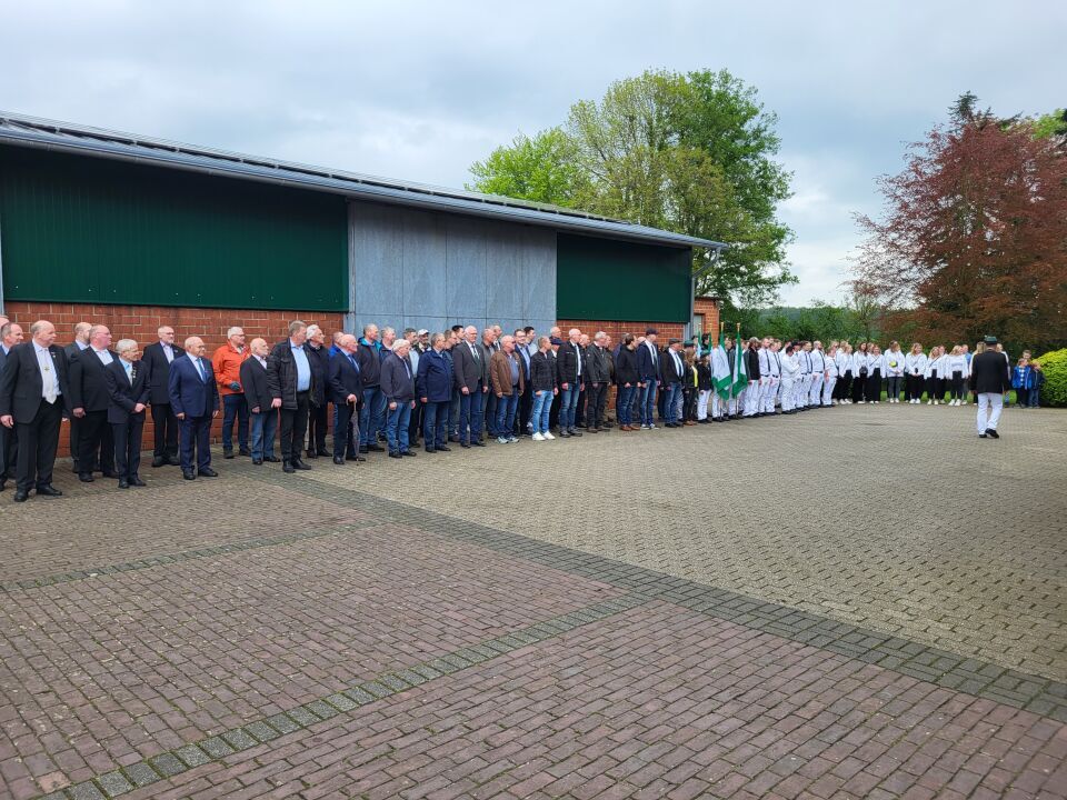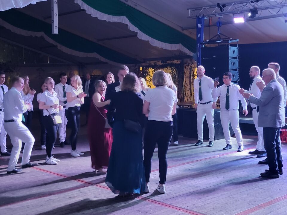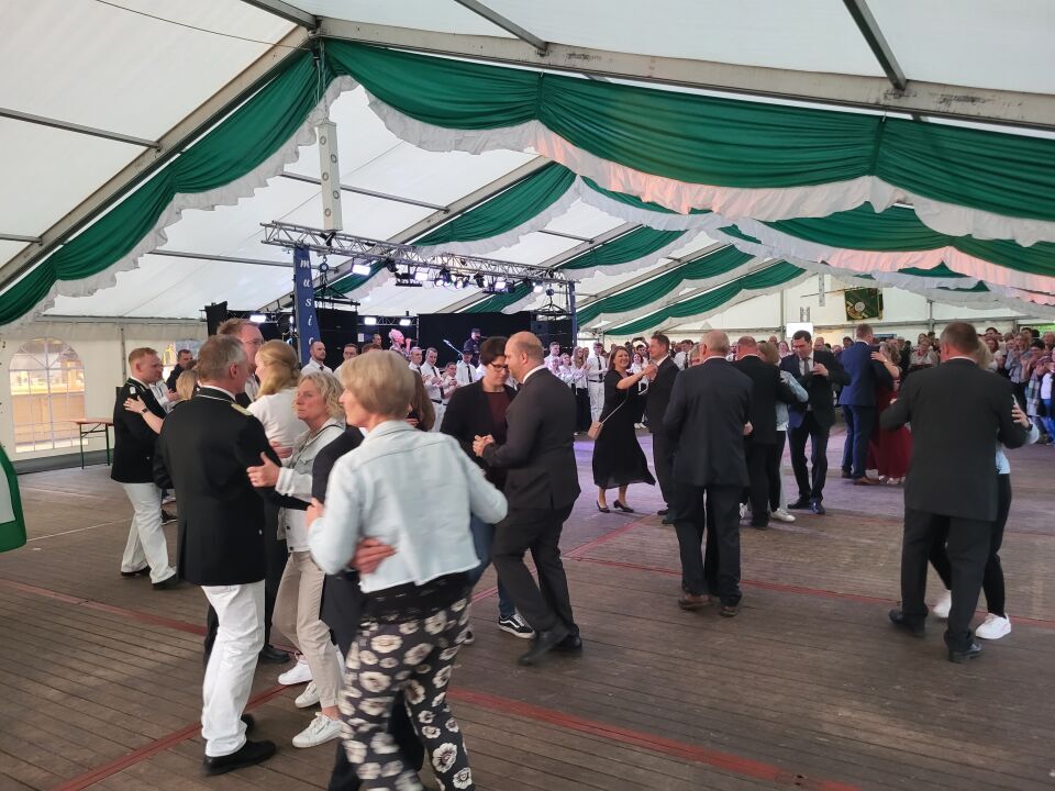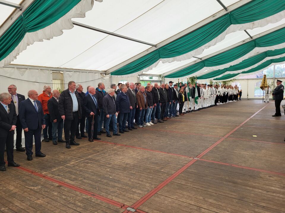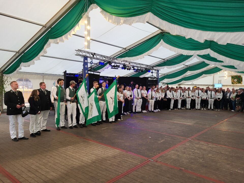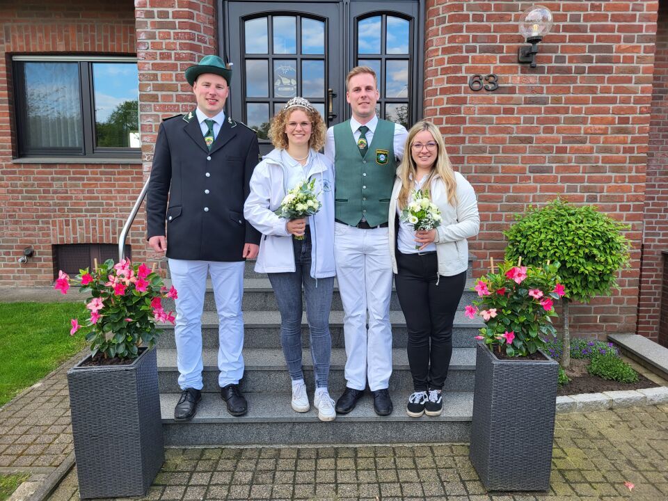 Pünktlich um 13.30 Uhr steht die Kompanie im Festzelt zum Antreten bereit. Nach dem Marsch zum Hof Brambrink wartete man gespannt auf das Erscheinen des noch amtierenden Königspaars samt Gefolge. Nach der Meldung an König Carsten, Königin Verena und dem Ehrenpaar Steffi und Claus schritt man zusammen mit Kommandeur Frank Brambrink unter großem Jubel die Kompanie ab und reihte sich in den Zug ein. Zurück auf dem Festplatz stellten unsere Fahnenschläger ihr Können unter Beweis.