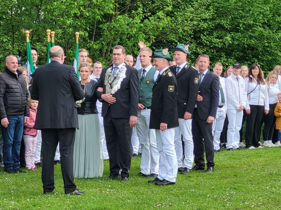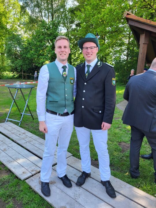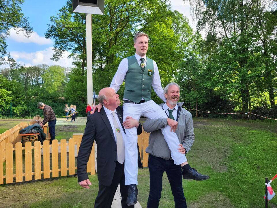 „Gute Freunde kann niemand trennen“ sang einst Franz Beckenbauer. Fahnenschläger Florian Lücke und Offizier Matthias Weiling sind solche und hatten sich für diesen Nachmittag einiges vorgenommen. Getrennt voneinander ans Gewehr mussten sie aber.Man lieferte sich unter den Augen zahlreicher Zuschauer einen spannenden Zweikampf um die Königswürde. Bei Sonnenschein und Musikbegleitung durch die Asbecker dauerte es bis 16.25 Uhr bis es im neuen Kugelfang leer war.