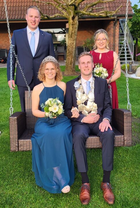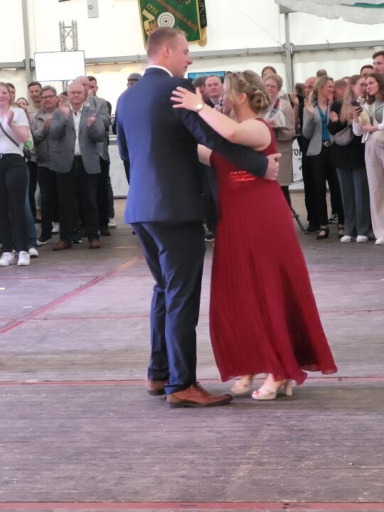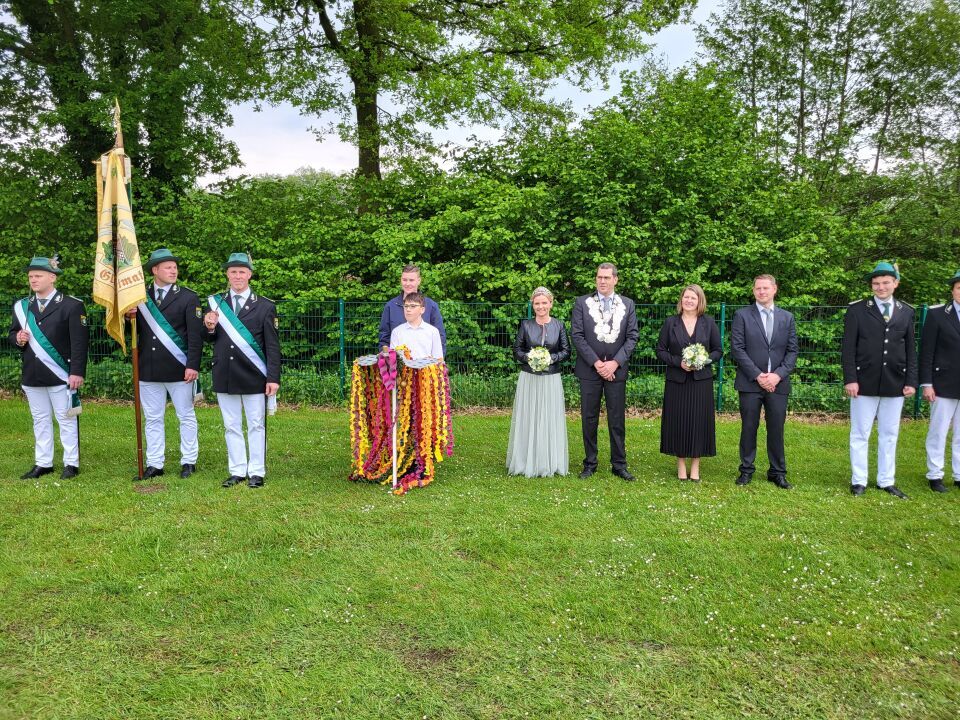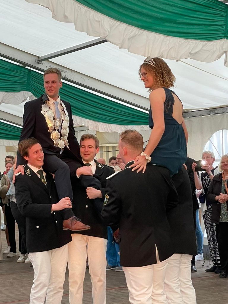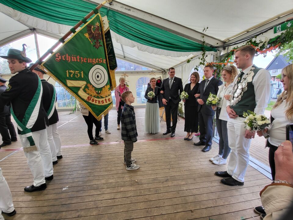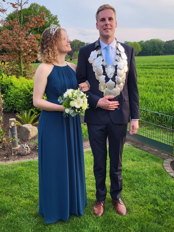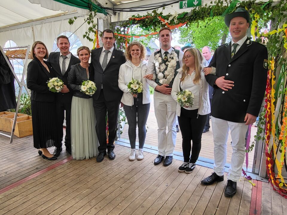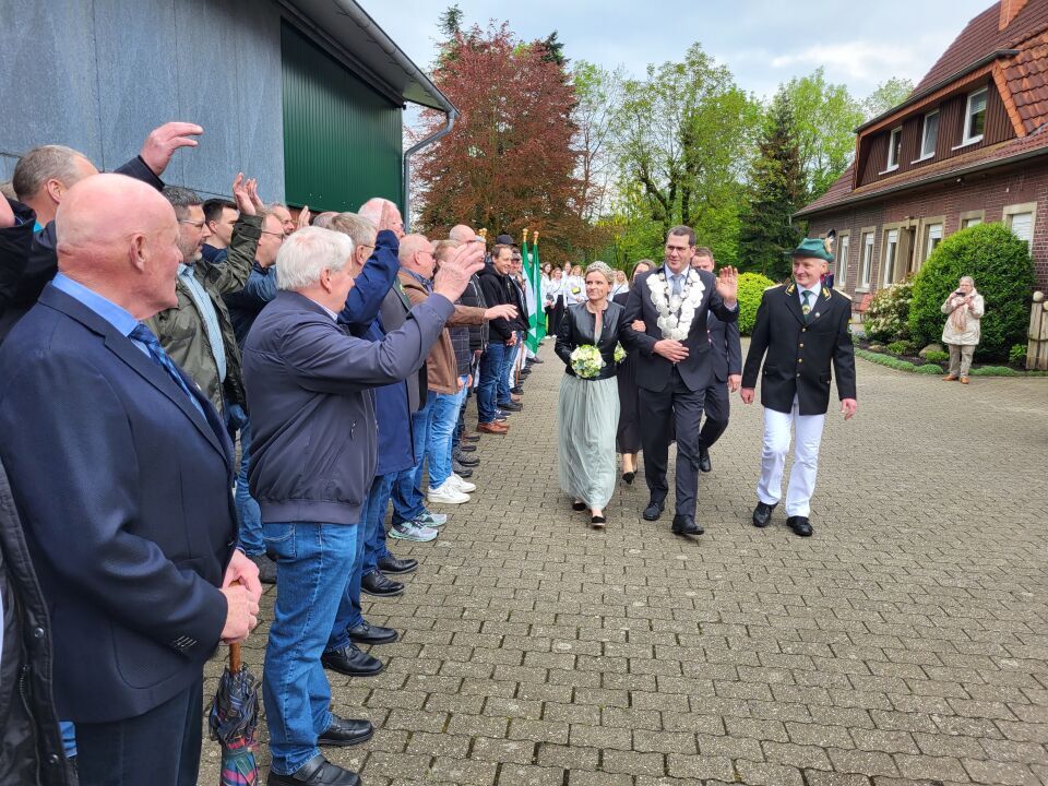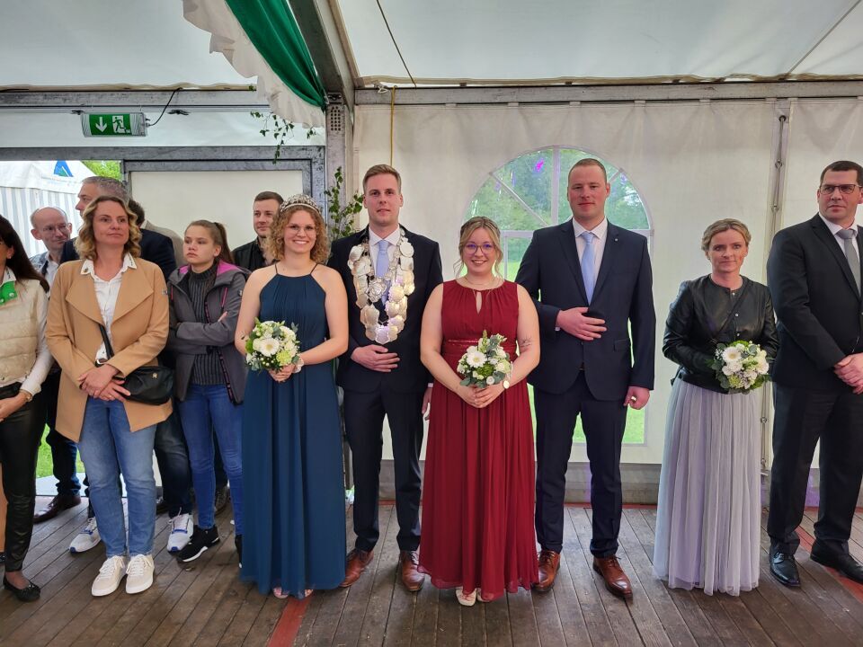 Einer kann es nur werden und heute hatte Florian das Quäntchen mehr Schussglück und ist neuer König der Börnster Schützengesellschaft. Zur Königin erkor er Gesa Kuhlbusch. Vorsitzender Bernhard Gövert bedankt sich beim scheidenden Königspaar und übergibt die Königskette von Carsten an die neue Majestät Florian. Im Zelt wird noch das Gedicht aufgesagt und ein Glas Sekt getrunken, dann heisst es „auf der Stelle weggetreten“.
