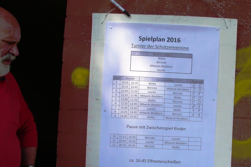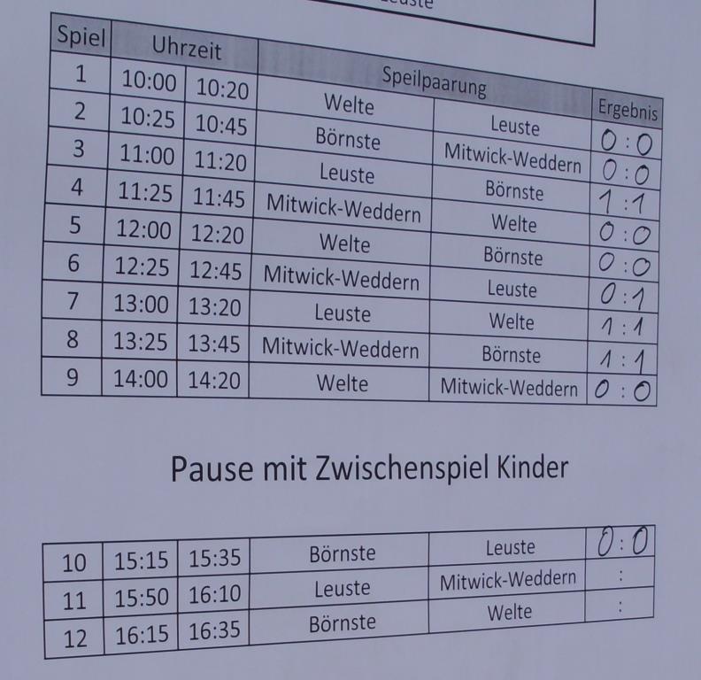 Leuste ist nach einem 2 : 0 gegen Mitwick – Weddern Turniersieger. Die Remiskönige aus Börnste und Welte trennen sich in ihrem jeweils sechsten Spiel unentschieden. Börnste wird dadurch guter Zweiter (ein Tor mehr geschossen als die Punkt- und Tordifferenzgleichen Welter).