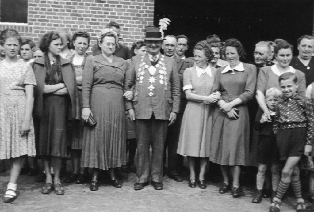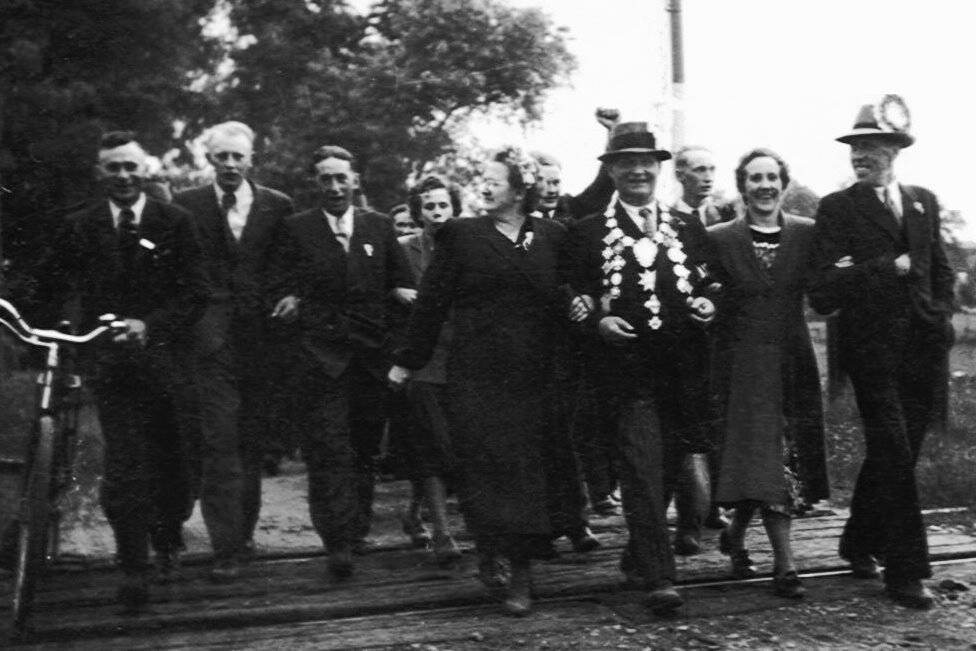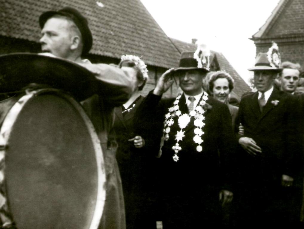 Bei herrlichstem Sommerwetter marschierten die Börnster Schützen unter den Klängen der Kapelle Fischer zum Königsschießen. Dort ließen sie sich nicht lange nötigen, sondern hielten es dem Vogel in seiner luftigen Höhe iördentlick up de´n Bast, wie man es seit jeher in Börnste so gewohnt ist. Vorsitzender Franz gneegelte sick eenen un sagg: „Scheit ih män, beß dat de Vuegel nich mehr so fast sitt, dann sall ick aöhm gieven, wat aöhm nao feihlt. Wat ich vaör fiefuntwintig Jaohr konn, dat faölt mi vondag auk nao nich schwaor. So Jungs, nu gaoht es´n Augenschlag up de Siet, laot mi es wier scheiten.“ Un Franz gifft aöhm dao buoben met de Donnerbüß, dat de Vuegel sick dreiht, es wenn he lebennig waör. „Eenen mot he noch hemmen, dann ligg he unnnen“, seggt son paar Jungs sachvaörstännig. Un richtig, dütmaol is´t passeert, watt buobn satt, ligg nu unnen un daomet is Franz Brambrink Sülverküinink. Franz lacht un dat „Volk“ jubelt aöhm tao. „Frau Josefa Schürhoff sall miene Küinigin sien“, segg de niee Majestät un … dann knallt kiene Kattenköpp, nee, et grummelt un glitzt watt drinsitt.