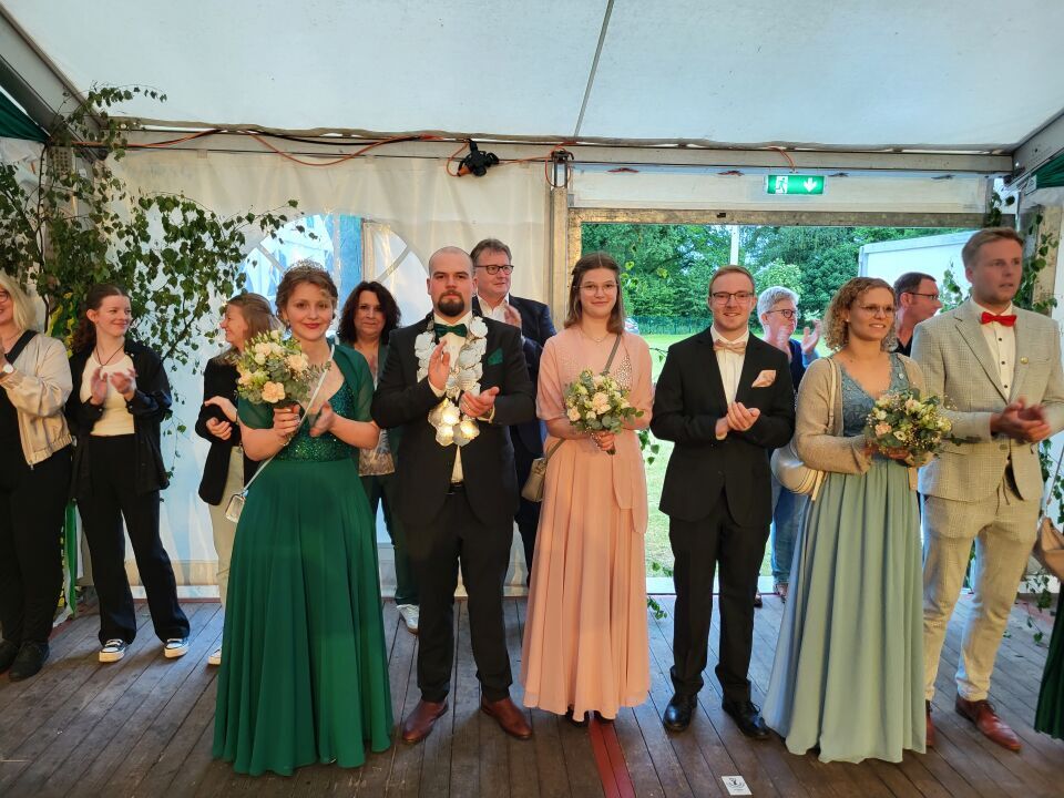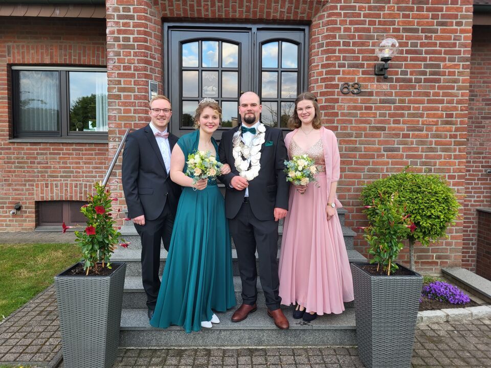 Der neue Börnster Thron mit Ehrendame Victoria Kenter, Königin Luisa Brambrink, König Max Wieschhörster und Ehrenherr Jonas Töns.