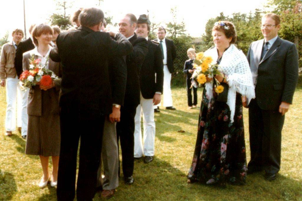 Aufgrund des ausgefallenen Frühschoppens konnte Franz Wilde am Sonntagnachmittag dem Königspaar eine wohl 70 Mann zählende, sichtlich erholte, Kompanie melden. Selbst an die 20 Jungschützen waren angetreten. Der Nachmittag bei sonniger Witterung lockte gegenüber den Vorjahren deutlich mehr Schaulustige an. An Bewerbern auf die Königswürde war kein Mangel. Dies gilt insbesondere für die Jungschützen. Sie hatten offenbar den wenigsten Respekt vor dem von Ewald Berning gefertigten Vogel. Dennoch war es Heinz Krunke, der allen mit einem gezielten Schuß zeigte, wie so ein Ding „von der Stange“ zu holen ist; unter dem Jubel der Anwesenden wurde er über den Schützenplatz getragen. Zur Mitregentin erkor er Frau Margret Knepper. Nach längerer Wartezeit, die an geeigneter Stelle von den anwesenden Schützenbrüdern genutzt wurde, konnte das Königspaar 80/81 proklamiert werden. Der abendliche Festball, der anfangs unter Startschwierigkeiten litt, nahm in den späteren Stunden einen heiteren und stimmungsvollen Verlauf. Diese Feststimmung hatte sicherlich nicht nur Gültigkeit für die Feiernden, sie dürfte auch auf den Festwirt übertragbar sein.