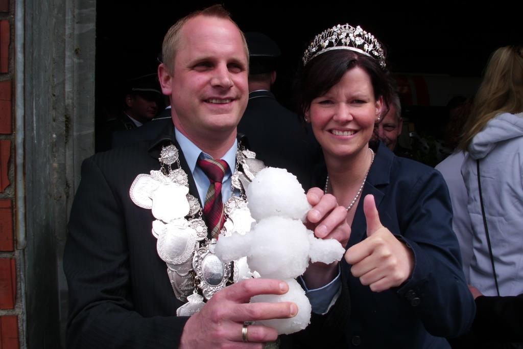 Dülmen. Die noch etwas „kühle Stimmung“ an der Börnster Vogelstange, die wohl auch dem plötzlichen Hagelschauer zuzuschreiben war, wurde später am Abend mehr als wettgemacht: Im beheizten Festzelt jubelten zahlreiche Gäste dem neuen Königspaar zu: Fahnenoffizier Andreas Weiling holte den Vogel zielsicher von der Stange und nahm Melanie Bergmann zu seiner Königin.