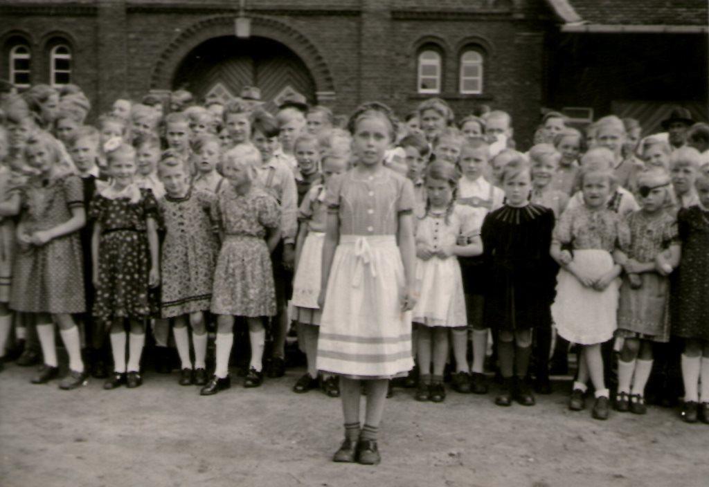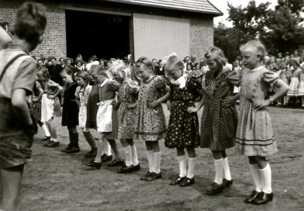 Der zweite Tag nahm seinen Anfang mit einer Gefallenenehrung. Wie vorher angesetzt war um 14.00 Uhr das Antreten wiederum auf dem Hofe Weiling. Von dort aus zogen weit über einhundert Schützenbrüder zum Kriegerdenkmal. Am Kriegerdenkmal legte Herr Hauptlehrer Ridder einen Kranz zur Ehre der Gefallenen nieder. Herr Hauptlehrer Ridder, der dann eine schöne Ansprache an die zahlreich versammelten Börnster und auswärtigen Gäste hielt, würdigte besonders den Heldenmut und die Opferbereitschaft der Gefallenen, die ihr Leben fürs Vaterland und somit für uns alle hingaben. Auch fand er Worte des Trostes, die besonders den erschienenen Müttern der Gefallenen galten, die der schlichten Feierstunde mit tiefbewegten Herzen beiwohnten. Nach einem stillen Gebet für die Gefallenen und dem Singen des Liedes vom guten Kameraden zog der lange Zug zurück zum Festzelt. Dort angelangt begann nach kurzer Zeit die Verlosung und Kinderbelustigung während die Schulkinder schöne Spiele und Reigen aufführten, die die Lehrerin Fräulein Rofalski mit ihnen eingeübt hatte.