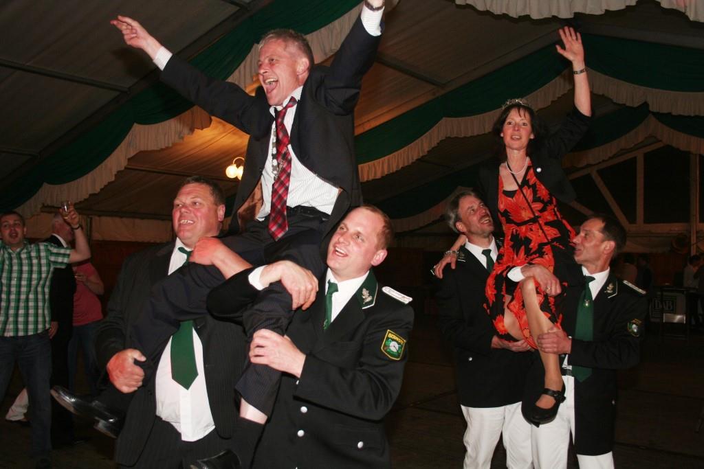 Anschließend erfolgte die Proklamation des neuen Königspaares und der Fahnenschlag. Sodann marschierten das Königspaar und die angetretenen Schützen ins Festzelt ein. Um 20.30 Uhr zogen dann das neue Königspaar und Ehrenpaar, der Thron 2011, Vorstandsmitglieder, Offiziere sowie Fahnenschläger nebst Partnerinnen ins Festzelt ein. Nach der Begrüßung durch den 1. Vorsitzenden, Bernhard Gövert, der u. a. auch zahlreiche Abordnungen anderer Vereine begrüßen konnte, erfolgte der Königstanz. Anschließend hieß es dann: Tanzfläche frei für alle! Das ließ sich keiner der Gäste zweimal sagen, wobei die Band Gigolos für den notwendigen musikalischen Schwung sorgte. Alle Feiernden waren in bester Stimmung bis spät in die Nacht.