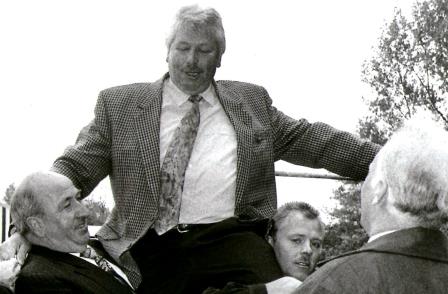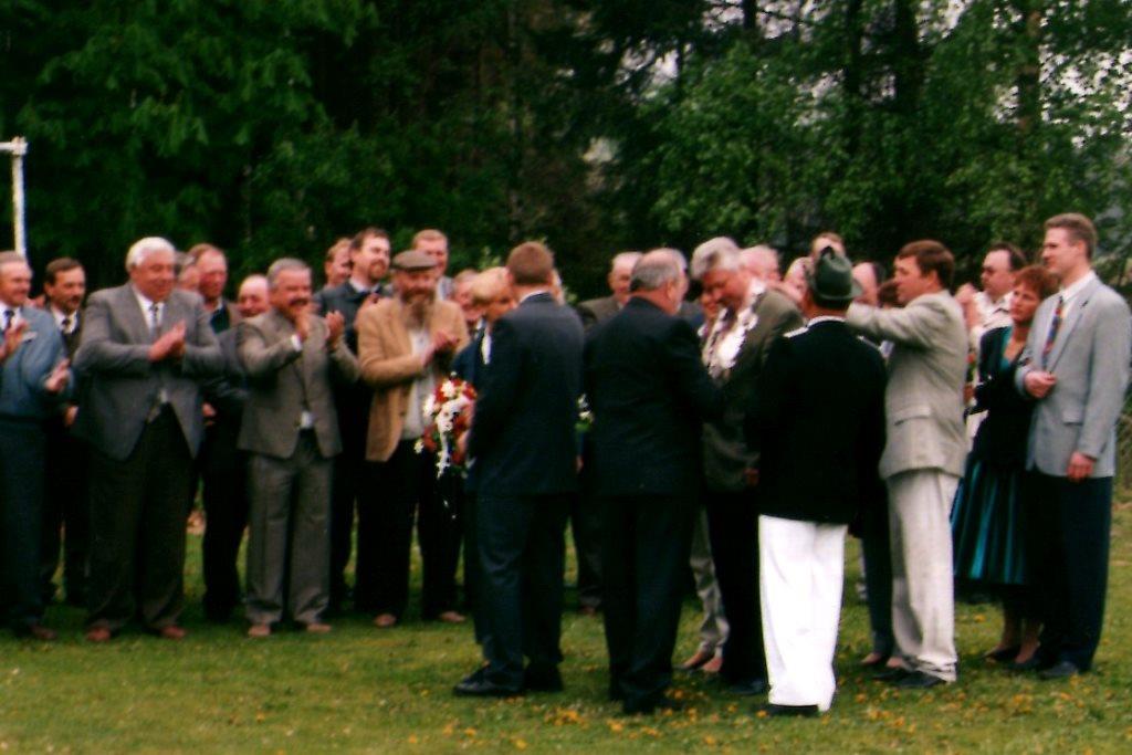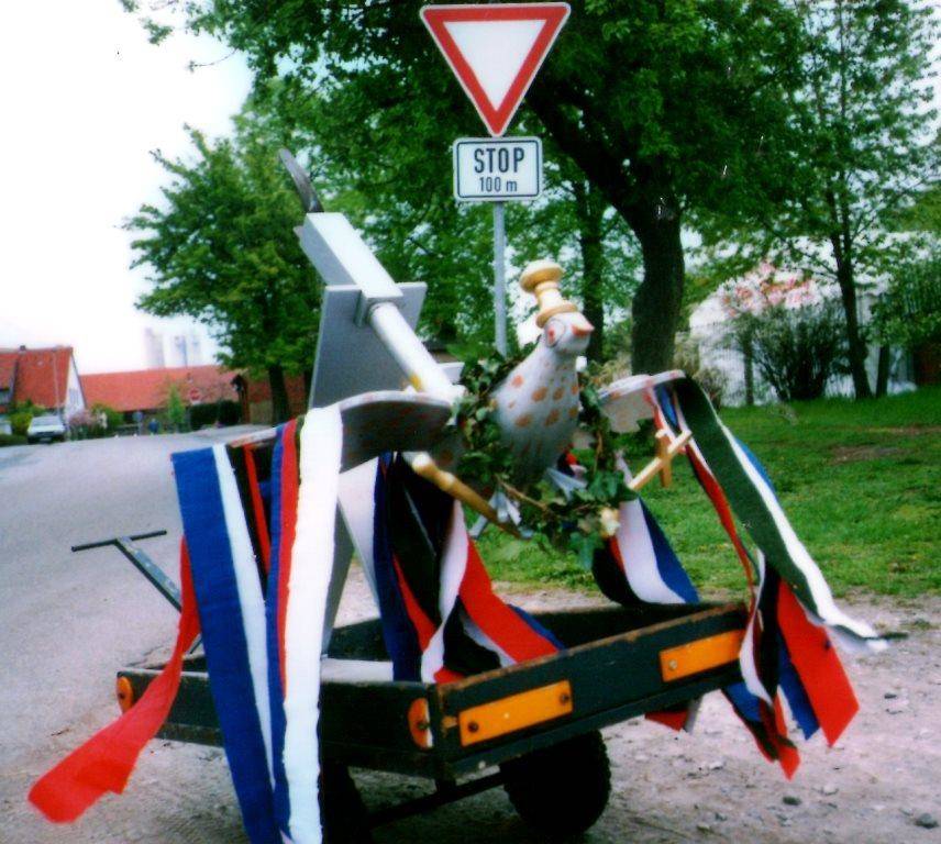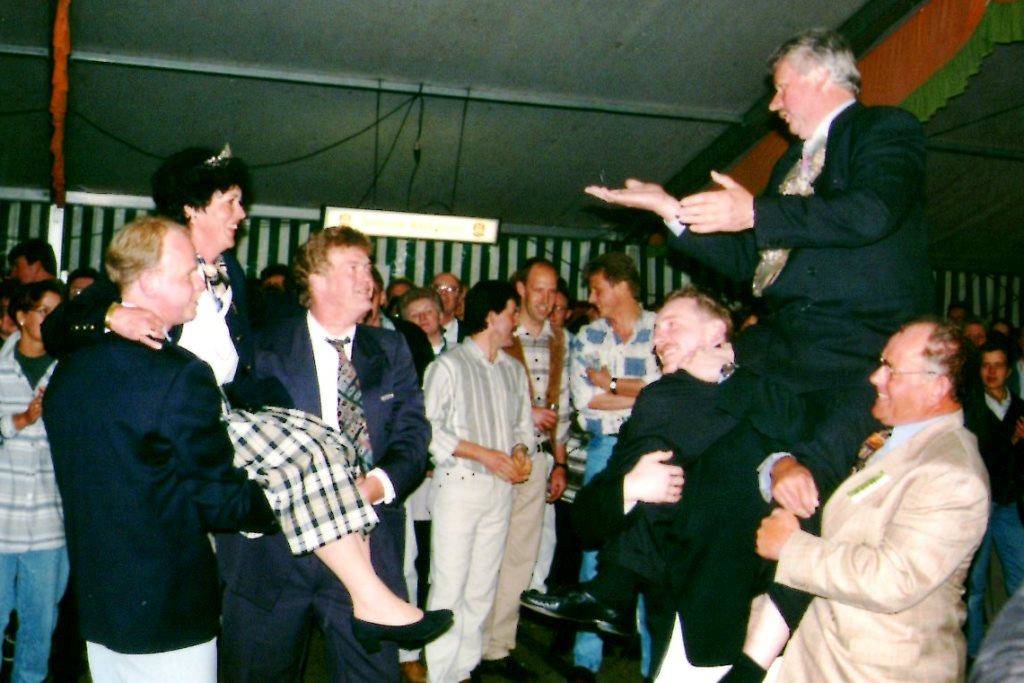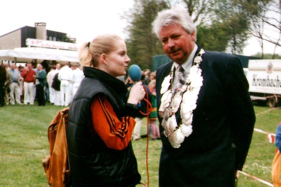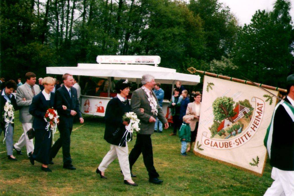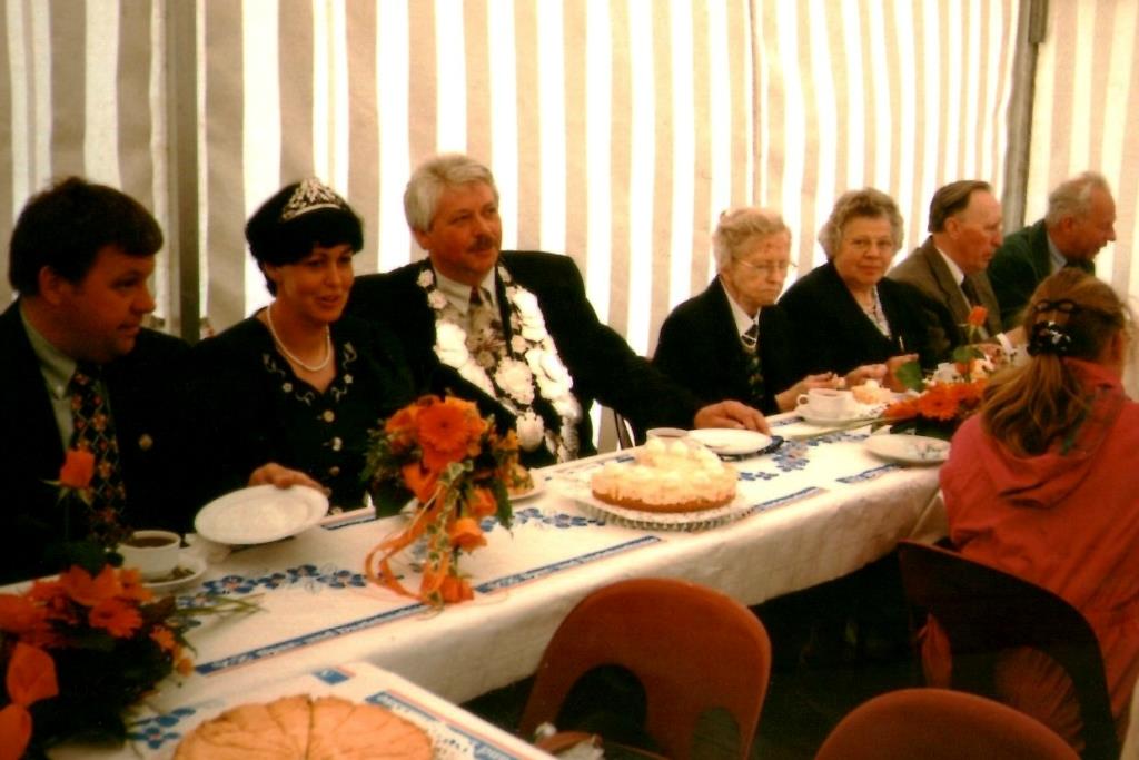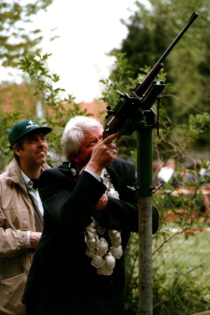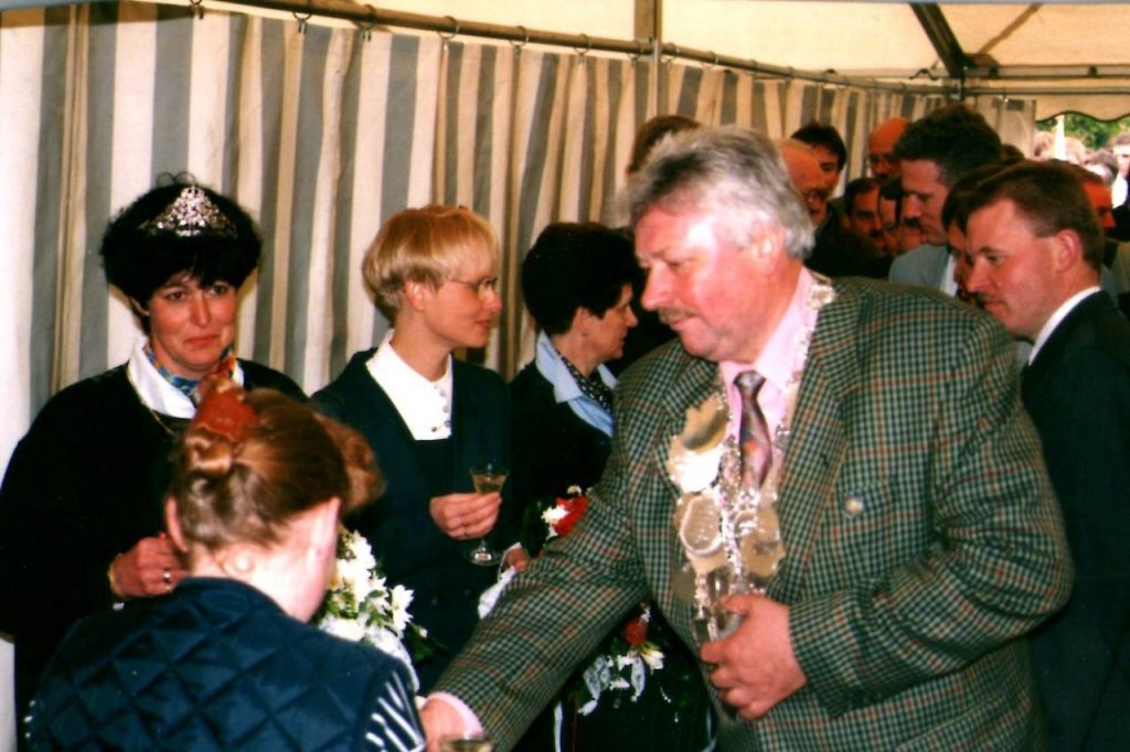 23 Jahre nach seiner ersten Thronbesteigung eroberte Bernhard Brambrink am Sonntag nachmittag um 16.15 Uhr mit dem 421. Schuß erneut die Königswürde des Börnster Schützenvereins. „Hal de Eier, ick gaoh scheiten!“ hatte der Regent von 1973 seiner Tochter noch bei der Entrichtung des Schußgeldes kurz vor seinem entscheidenden Treffer schmunzelnd zugerufen. Damit spielte Brambrink auf die alte Sitte des nächtlichen Eierbackens im Hause der Majestät an. „Und dann hat er gnaz spontan, sozusagen aus dem Ärmel mit seinem ersten und einzigen Schuß den Königstreffer gelandet“, berichtete Vereins-Vize Heinrich Potthoff, der die Szenerie an der Vogelstange genauestens beobachten konnte.