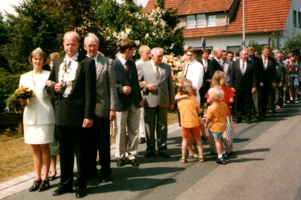 „Wenn das jetzt noch lange so weitergeht, müssen wir wohl den Frühschoppen ausfallen lassen“, so ein Börnster Jungschütze am frühen Sonntag abend. In der Tat wurde die Geduld der Schützenbrüder und Zuschauer beim Vogelschießen des Schützenvereins Börnste auf die Probe gestellt. Um 18.28 Uhr nach rund 400 Schüssen mit dem Kleinkalibergewehr, brachte der neue König Bernhard Gövert den Vogel mit dem 185. Scharfen Schuß zum Absturz.