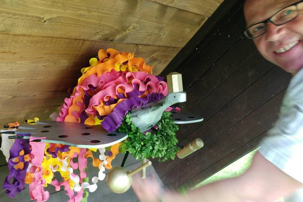 Sie beschäftigen sich hingebungsvoll mit dem festlich geschmückten Vogel und finden mühelos ein schattiges Plätzchen für den Hauptdarsteller des heutigen Nachmittags. Berauscht von der nachbarschaftlichen Meisterleistung schwingt das ach so hübsch geschmückte Federvieh mühelos in höchste Börnster Höhen.