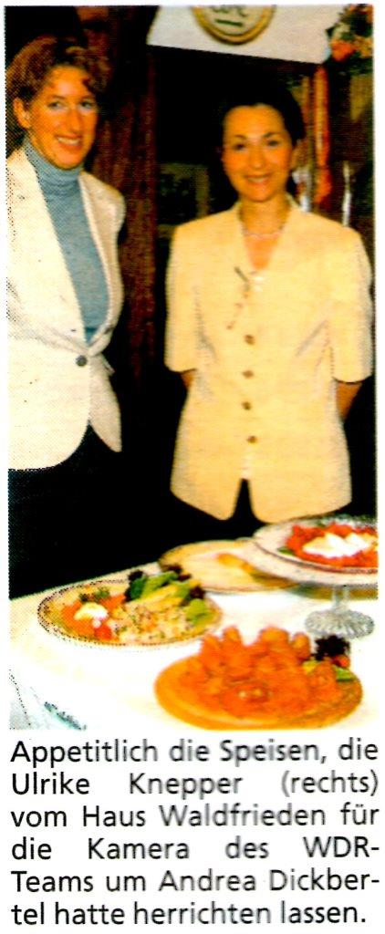 Und so ist Ulrike Knepper als Haus-Waldfrieden-Inhaberin auch eine Interview-Partnerin für Andrea Dickbertel, die im Laufe der Jahre wohl schon rund 150 Lokalzeit-Unterwegs-Beiträge produziert hat. Ein paar Bilder auch von der duftenden Waldmeister-Mai-Bowle werden abgedreht – natürlich wird sie auch verkostet – bis die Szenen im Kasten sind.