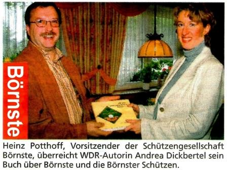 Börnste. „Irgendwann kommen sie, das hab´ ich immer gesagt“, raunt Ex-Schützengesellschafts-Vorsitzender Josef Lücke, als er sich vergangenen Freitag an den Tisch im Haus Waldfrieden niederlässt. Es ist gegen elf Uhr am Vormittag, und die freie WDR-Autorin Andrea Dickbertel, Kameramann Frank Deitert und Ton-Mann Sven Christian Lay besprechen sich gerade mit Heinz Potthoff. Was soll alles hinein in den Beitrag für die „Lokalzeit Münsterland unterwegs“, die am Abend 3 Minuten 30 von Börnste berichten will? Rundherum sitzen etwa 70 Börnster, vom Kind bis hin zu Josef Weiling, mit 82 Jahren der Älteste in der Bauerschaft.